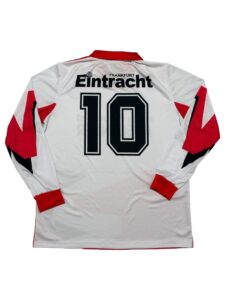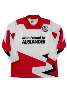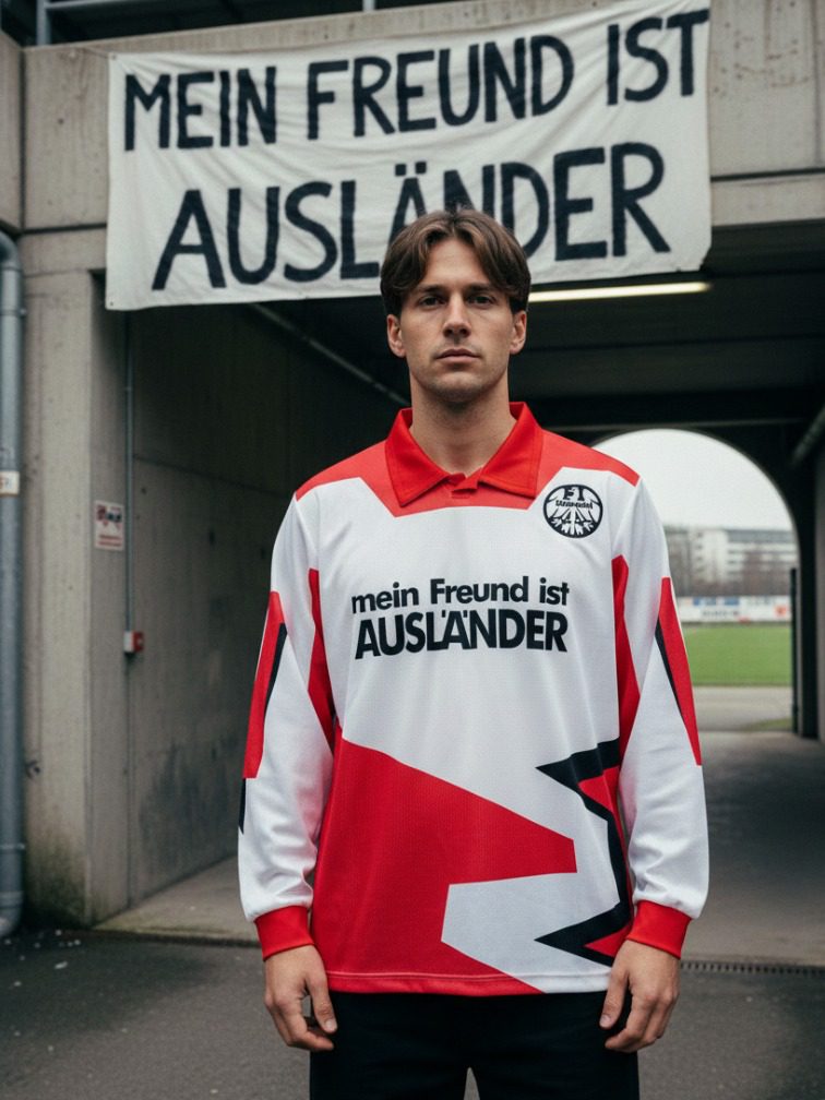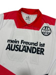 The Eintracht Frankfurt 1992-93 jersey stands as one of the most culturally powerful football shirts of the early 1990s. Featuring the bold “Mein Freund ist Ausländer” message, this kit became a symbol of solidarity and identity in Bundesliga history. A true collector’s piece from a defining era of German football.