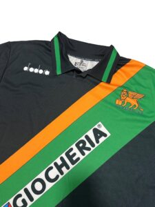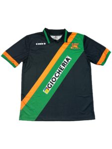 The Venezia FC 1992–1993 Home Shirt is one of the most distinctive Italian football jerseys of the early 1990s. Featuring the bold diagonal Giocheria sponsor and Venice’s unmistakable green-orange accents, this shirt represents a fearless era of Calcio design.